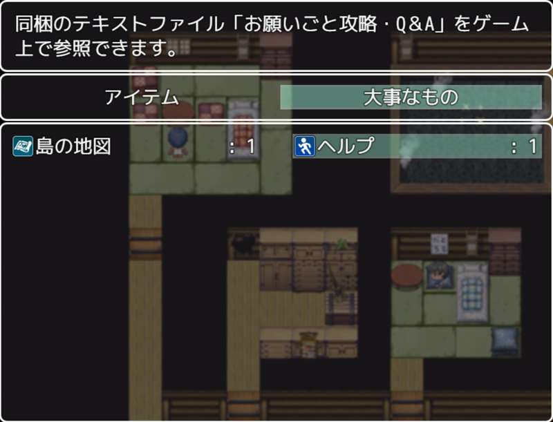 こちらは同梱のテキストファイルにあります「お願いごと攻略」「Q&A」がゲーム内でどこでも確認できるアイテムになっております。
