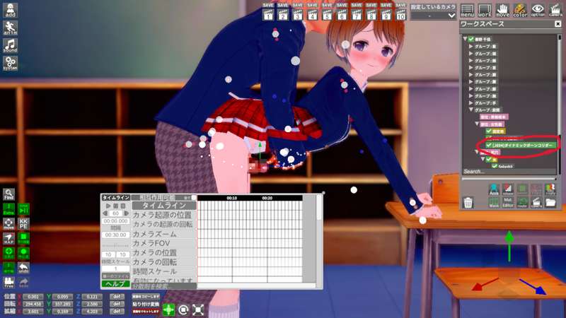 動画のシーンデータでは、アイテムのコリダーを動かしてスカートのめくれ具合を調整できます。(※「setumei」)