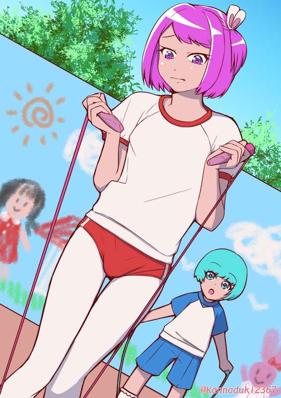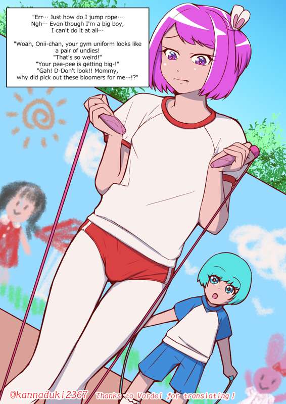 「えーっと、なわとびってどうやるんだっけ……うう、ぼく、ほんとはおにいちゃんなのに、ぜんぜんできない……」 「わー、**ちゃん、ぱんつみたいなたいそうぎきてるー!」 「へんなのー!」 「おちんちんふくらんでるー!」 「やぁっ、み、見ないでぇ~!! うえーん、ママってば、どうしてぶるまーなんかよういしたんだよぉ……!」 ごく普通の幼稚園の縄跳び風景です。(幼稚園の年少組で縄跳びをするのだろうか…?) ※英語版を追加しました。Vardei様、ありがとうございます!