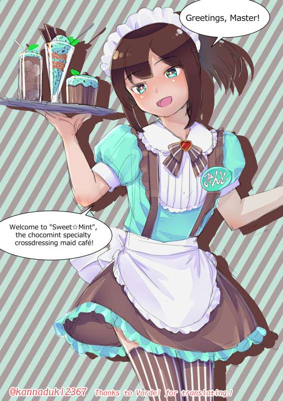 チョコミント専門女装メイド喫茶で働くメイドくんの落書きです。 英訳を頂いたので英語版を掲載しました。Vardei様、ありがとうございます!