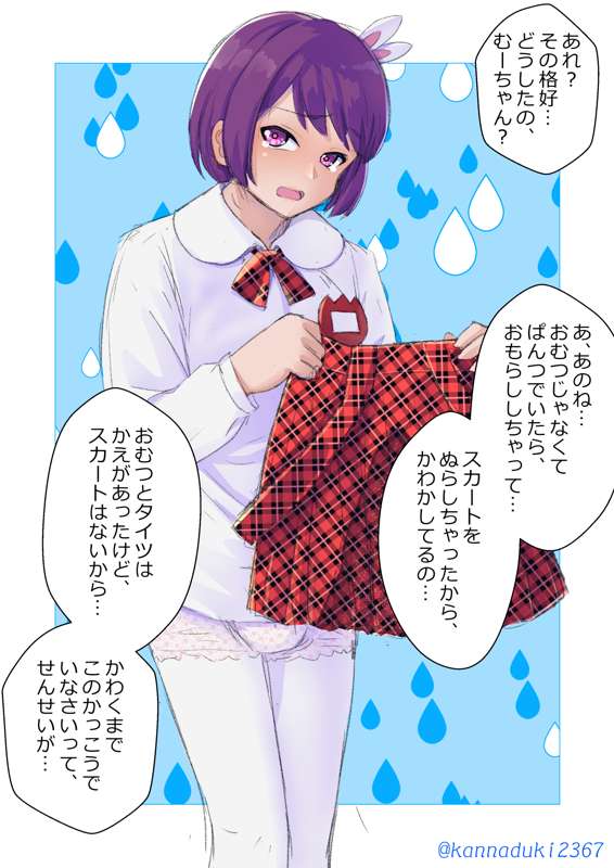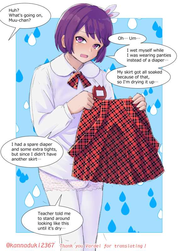 イキって「おもらししないから!とお姉さんパンツで登園したはいいものの、通園バスでおもらししてしまい、濡らしてしまったスカートを乾かす、幼稚園児なお兄ちゃんの落書きです。 ※英語版を追加しました。Vardei様、ありがとうございます。