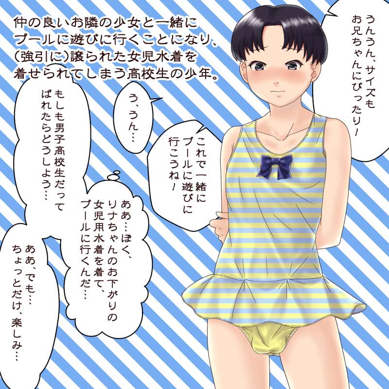 仲の良いお隣の少女と一緒に プールに遊びに行くことになり、 (強引に)譲られた女児水着を 着せられてしまう高校生の少年。