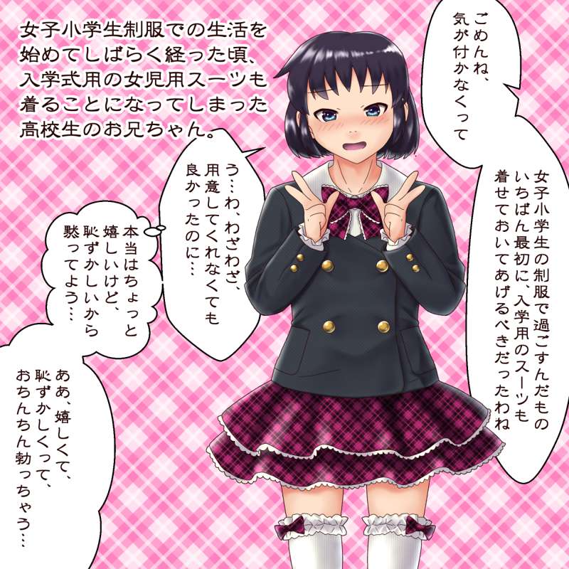 女子小学生制服での生活を 始めてしばらく経った頃、 入学式用の女児用スーツも 着ることになってしまった 高校生のお兄ちゃん。