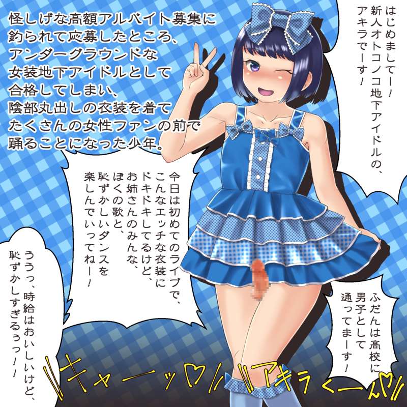 怪しげな高額アルバイト募集に 釣られて応募したところ、 アンダーグラウンドな 女装地下アイドルとして 合格してしまい、 陰部丸出しの衣装を着て たくさんの女性ファンの前で 踊ることになった少年。