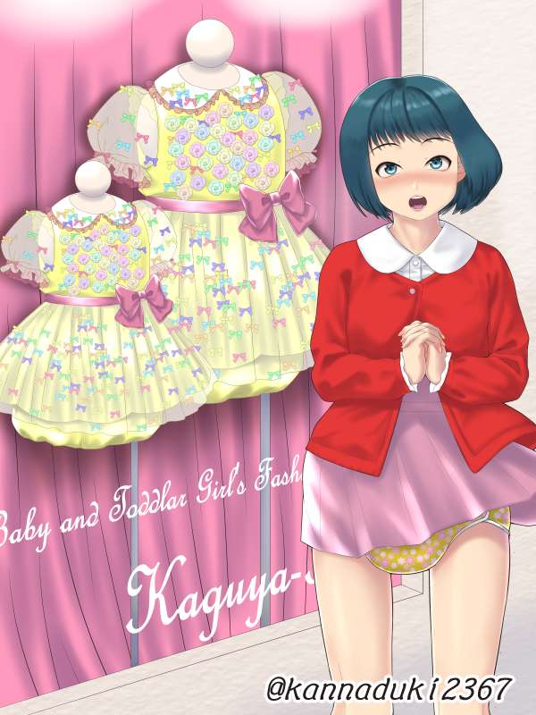 新作「おそろい兄妹3」で使う予定のイラスト二枚目です。 すっかり「妹」になったゆまちゃんこと雄馬くんは、女児ベビー服を着せられて駅近くの雑居ビルに連れて来られてしまう。そこにはなんと、大人サイズのベビー服・女児服専門店があって……!