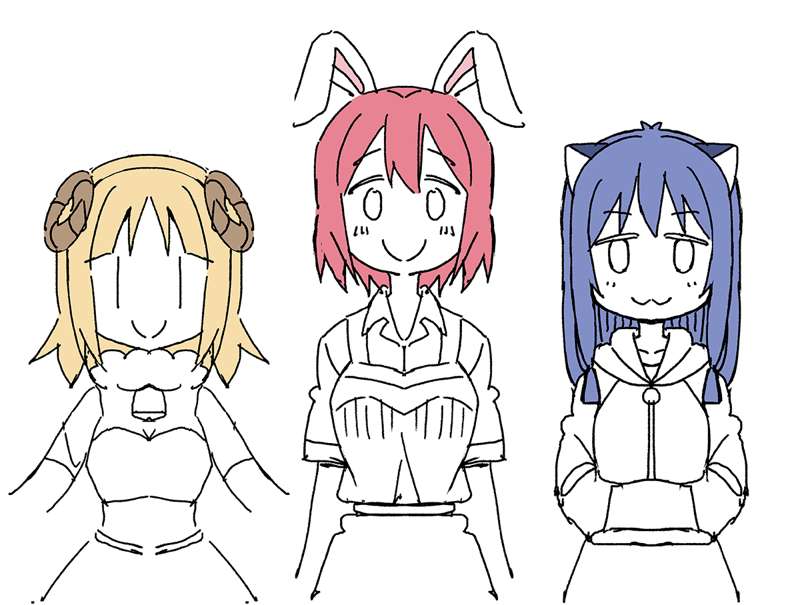 実は先日「一番くじ」の公式宣伝マンガを描かせていただきまして、 前回のワンフェスでちょっとした動画形式で公開されていたとか。 私も見たかった…! WEBで見れるようにならないかなあ。 こちらはそのマンガ用に用意したキャラクターの初期案です。 ケモミミにNGが出て、完成品では耳なしになりました。 あと黄色の子も居なかったことに…。 というわけで、ここで供養させていただきます。