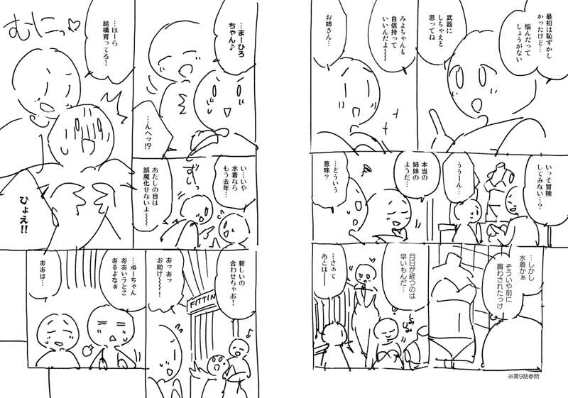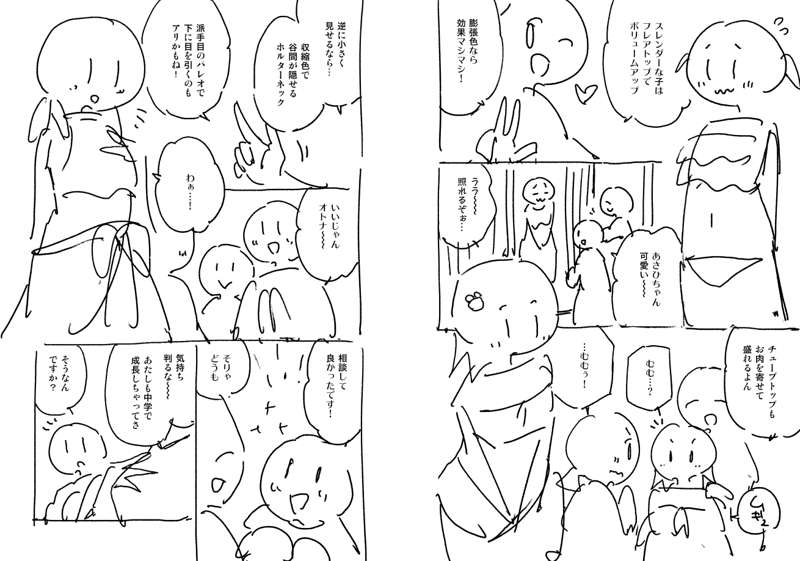 「胸の小さい子は立体感のある水着を着るとボリュームが出て大きく見える。白や薄い色は膨張色なのでさらに視覚効果が得られる」という内容をどうするか。まず膨張色がどういう色かは絵で補足できるのでカット。あとはそれぞれ程よい文字数の簡潔な言い回しを探していって、