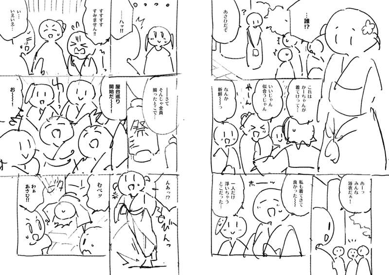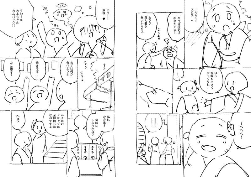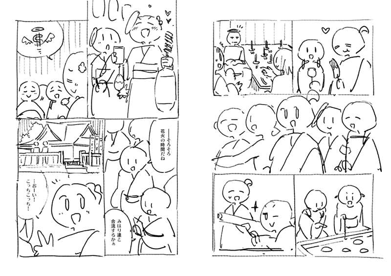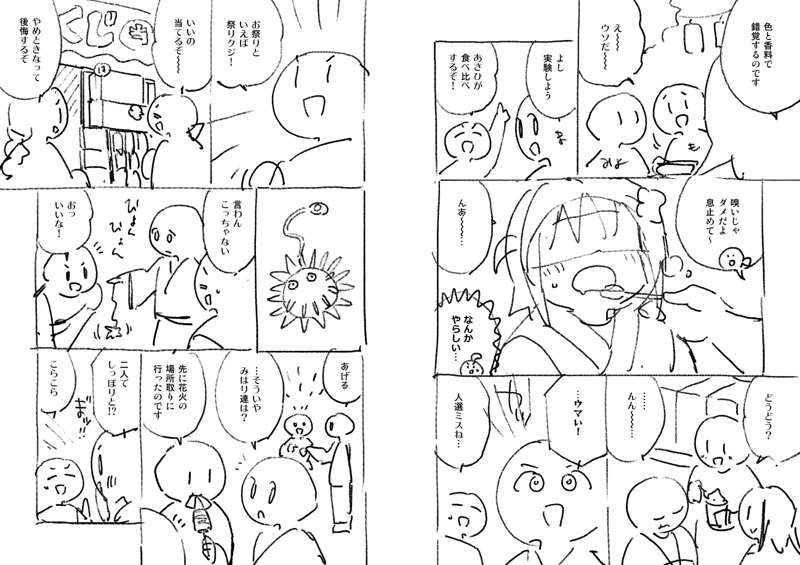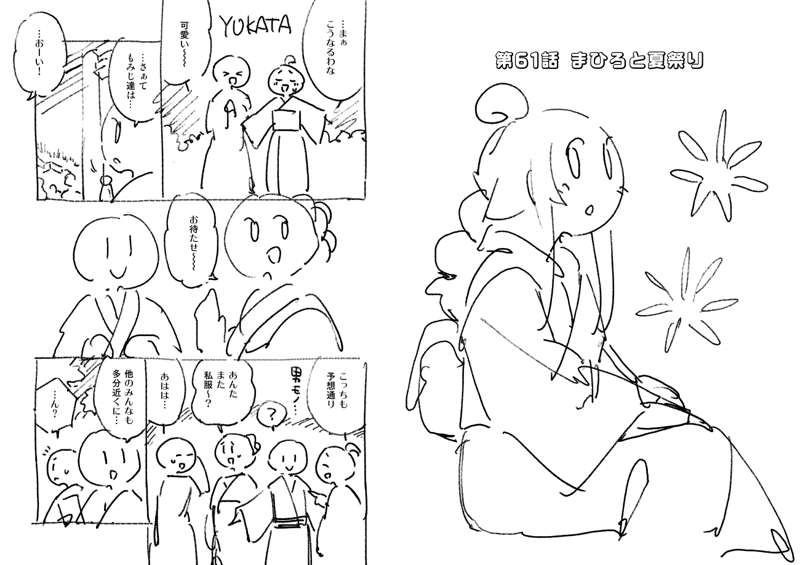 61話のネームです。 夜店の屋台は描くのが大変なので、うまいこと省略しつつ… 黒ベタが多いと画面が締まるので、夜のお話は良いですね。