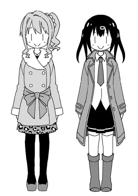 みはりも珍しく私服に… でもロングコートだとあんまり雰囲気変わりませんね。 背はかえでのほうがちょっと高いです。 実はまだあと2着あるのですが、 完全にネタバレになるので残りは本編をお楽しみに! ちなみに今回あさひとみよちゃんはお休みです。 今日は慣れない作業をして頭を使いました。 夏コミでお披露目できることでしょう…(多分)