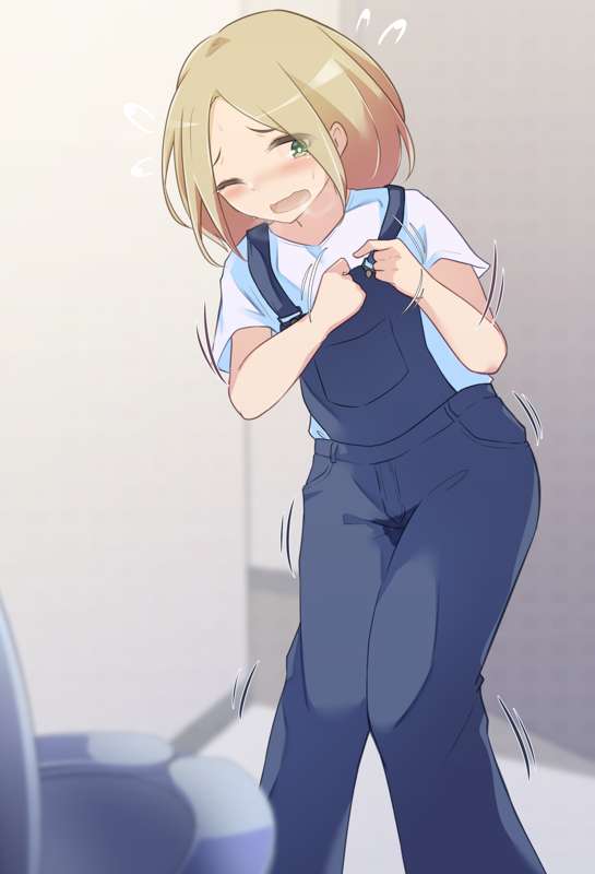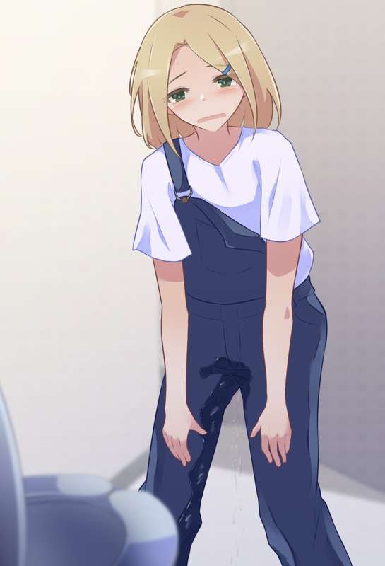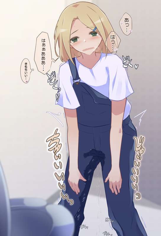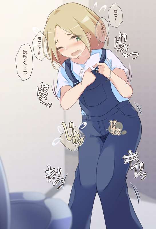 オーバーオールが脱げずトイレ目前で服の中に全部出しちゃう女の子【ミニイラスト1枚+カラーイラスト2枚】