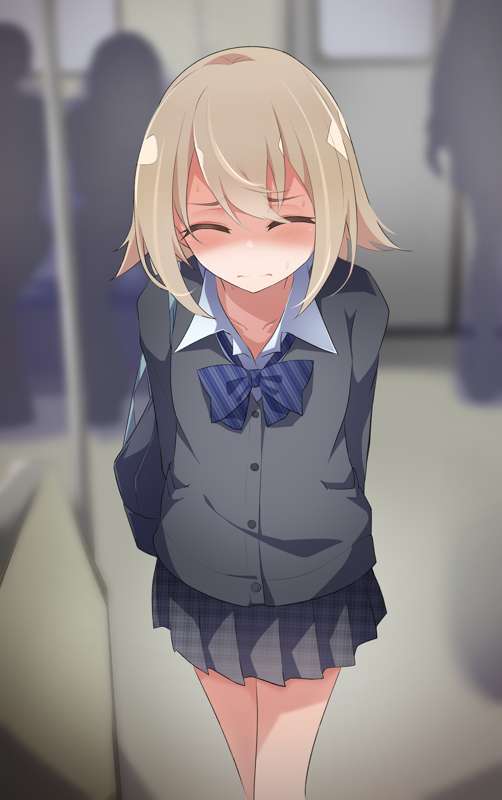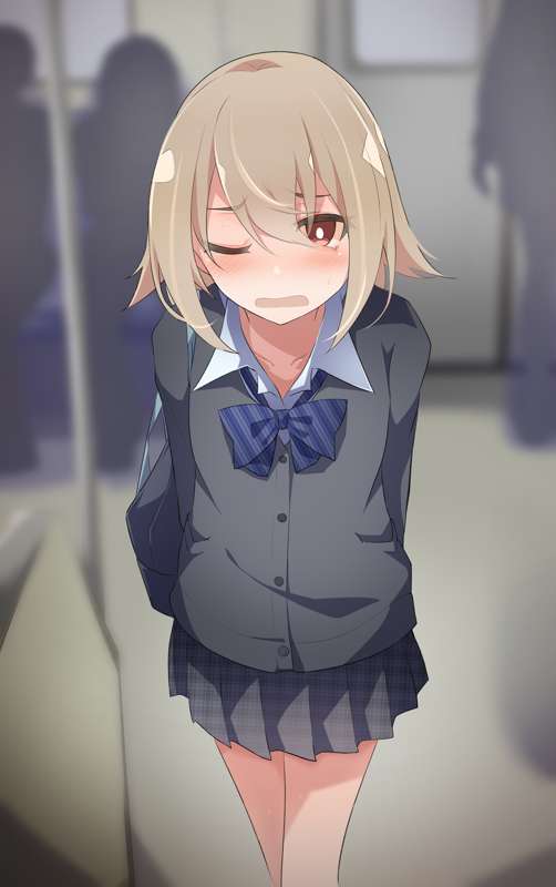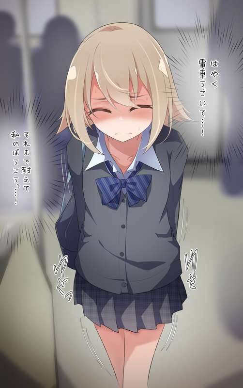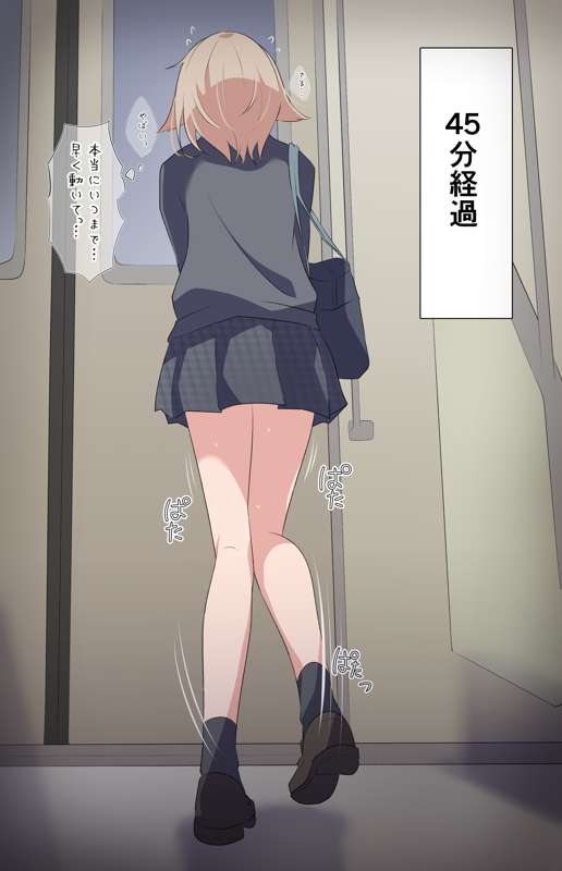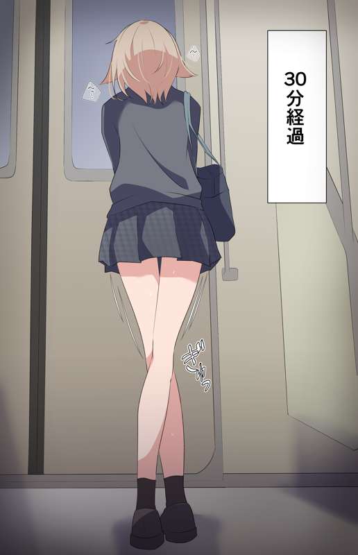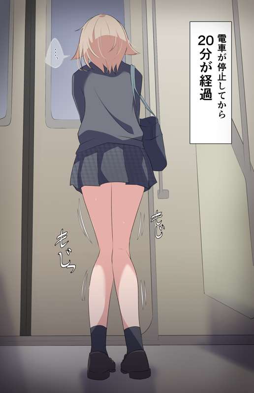 電車が止まってしまいおもらししてしまったミニスカ制服女の子【ミニ漫画+我慢+おもらしカラーイラスト】