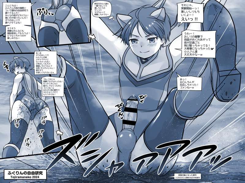 ギガ化して小人さんの街にお尻を向けるふぐりん。 自由研究のためと言っていますが…果たして!?