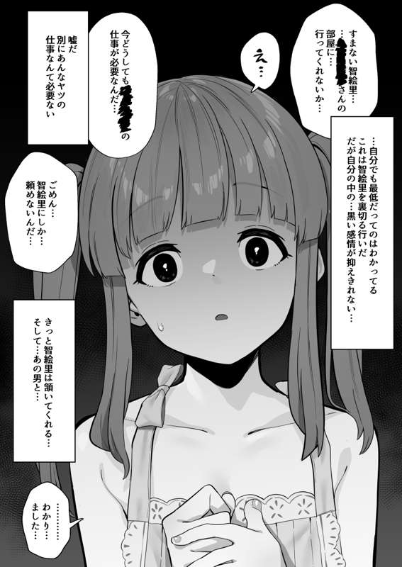 ※寝取らせです プロデューサーと智絵里は恋人の関係。 智絵里はプロデューサーの事を心から愛し信頼していた。 プロデューサーも同じく智絵里の事を愛していたが、 それとは別にある欲望を抱いていた。 (智絵里は俺のためなら何でもしてくれんじゃないか… 例え自分が嫌悪する様な男に抱かれる事でも…) その欲望はどんどんと膨らんでいき… ついに実行に移す。