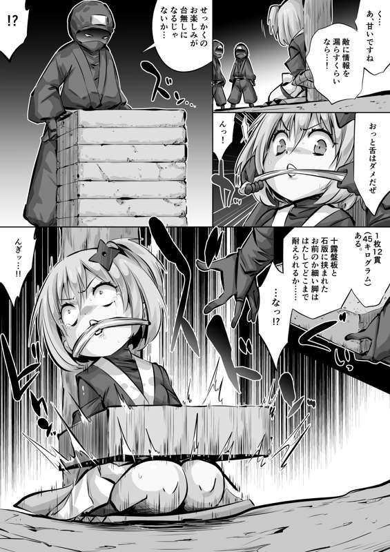 くノ一ちゃんで学ぶ、拷問・処刑の歴史1話「石抱き」6p目(石板1段目)(毎日ヒロピン「マンガ」1541のグレスケ)