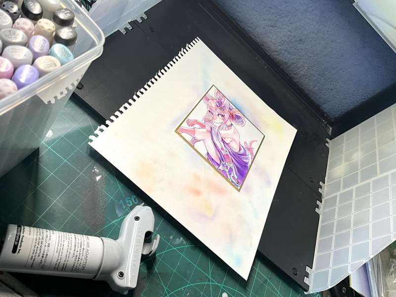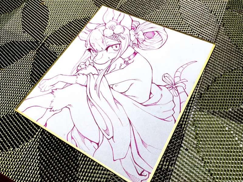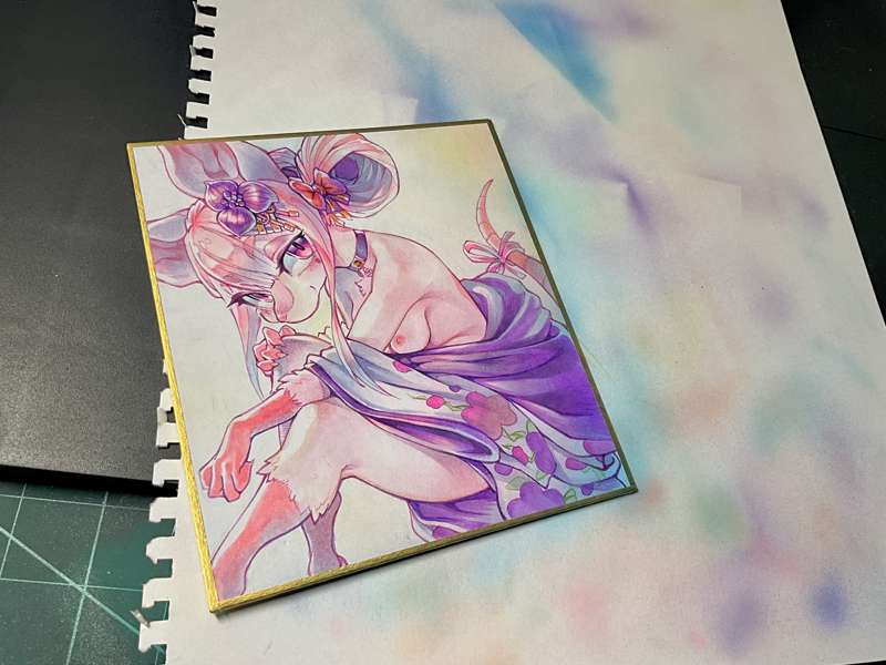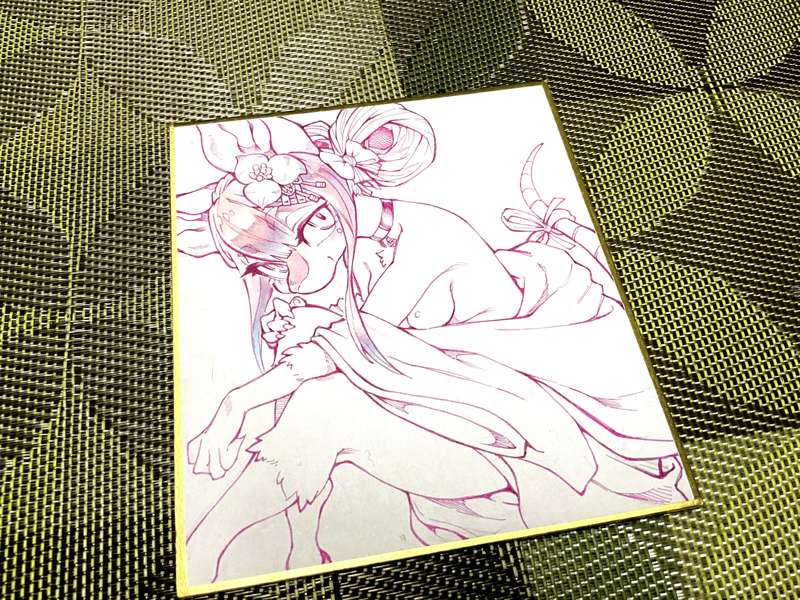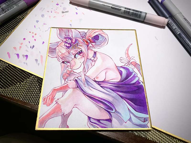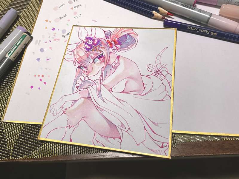 小サイズ色紙です。 まず線画をピンク色のミリペンで描き、薄い色をちまちまと乗せていきます。今回は極力コピックの良さを引き出したいのでアニメ塗りのようにくっきりした影にはせず、色鉛筆もあまり使用しないようにしました。全体が塗れたらコピック用エアブラシで全体にトーンをつけて、白のポスカでハイライトを入れれば完成です。 こちらの色紙はりんごあめプランの方々のプレゼント企画に使わせていただきます。