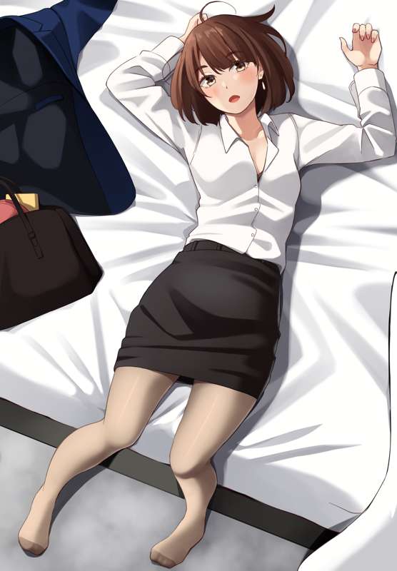 残業から帰ってきてベットでダラダラしてる腐れ縁元同級生です あまり見慣れない仕事着の腐れ縁元同級生のいいぞ!! 仕事中は髪の毛を結んでます