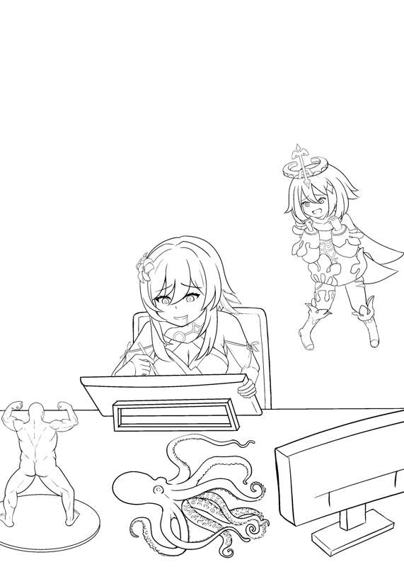 表紙、まえがき、奥付け、表紙裏の線画完成~ 来週にできれば投稿したい・・・ Line drawings of the cover, foreword, back cover, and back cover completed~. I hope to post them next week...