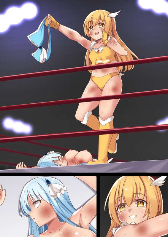 またも格下に敗れ万歳失神KO(https://www.pixiv.net/artworks/123363514) の限定イラストです。 脱がされたコスチュームを観客にプレゼントしようとするひかりちゃん。すっかりメスガキっぷりが板についてきましたね。 元々真面目な性格なので、盛り上げるのもしっかりやります。 もちろん楽しんでますけどねw