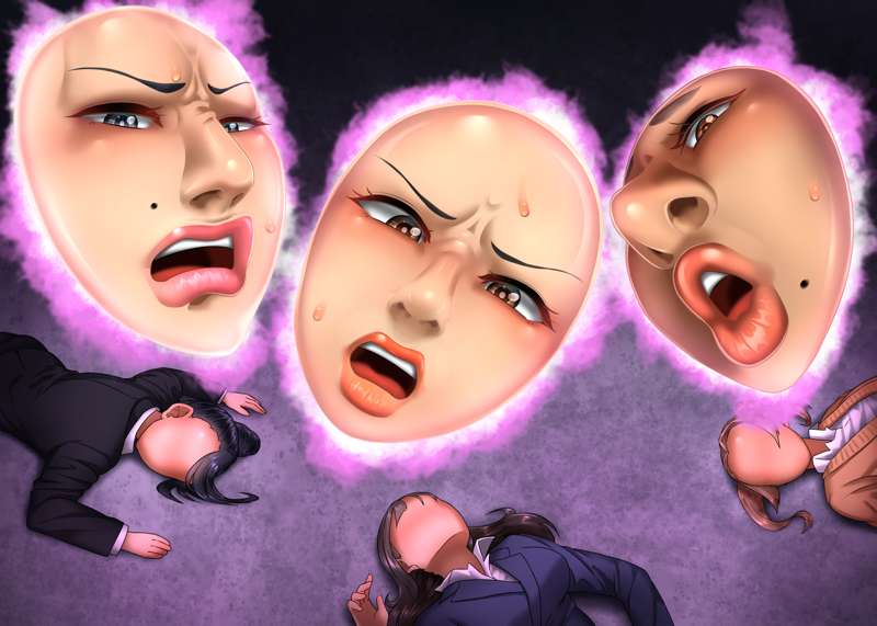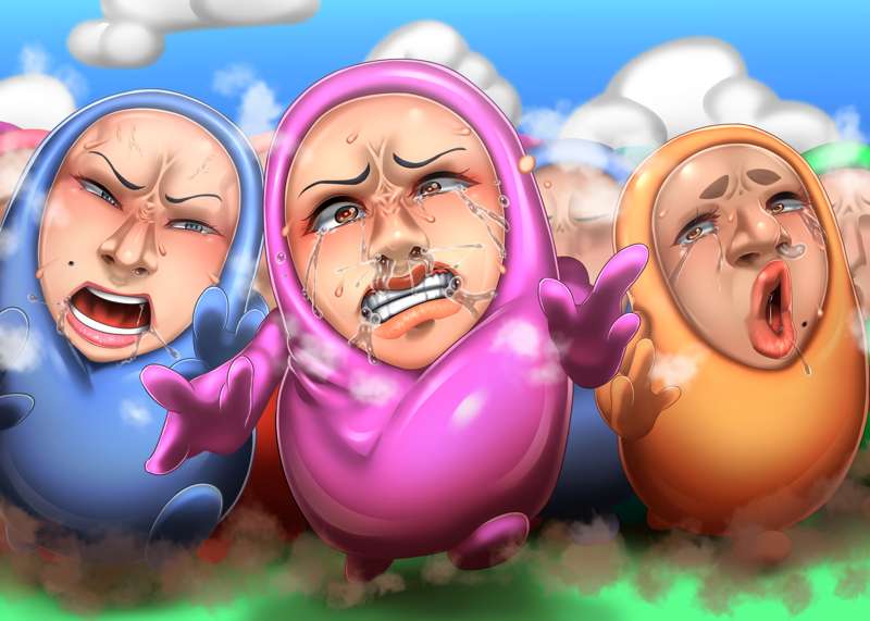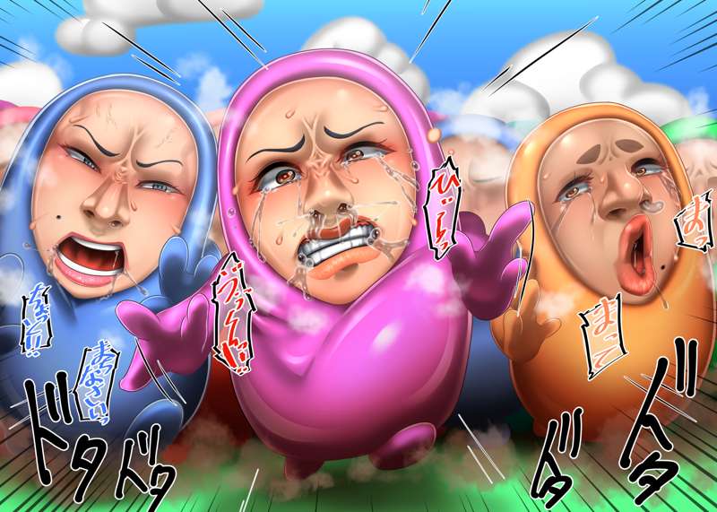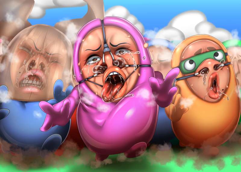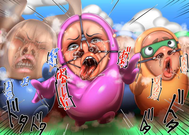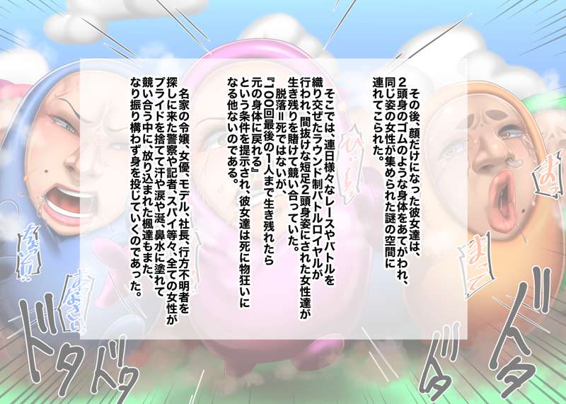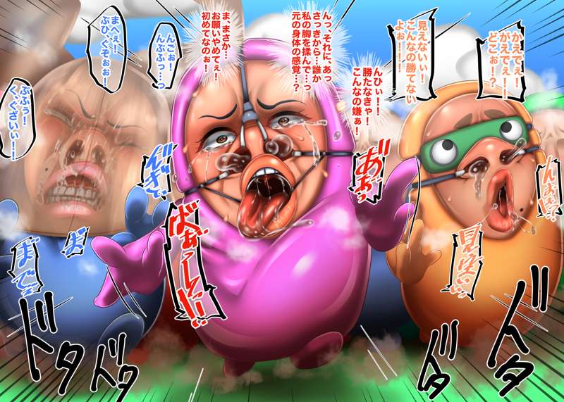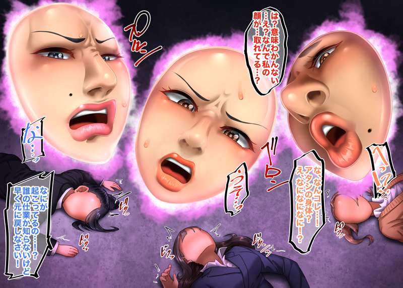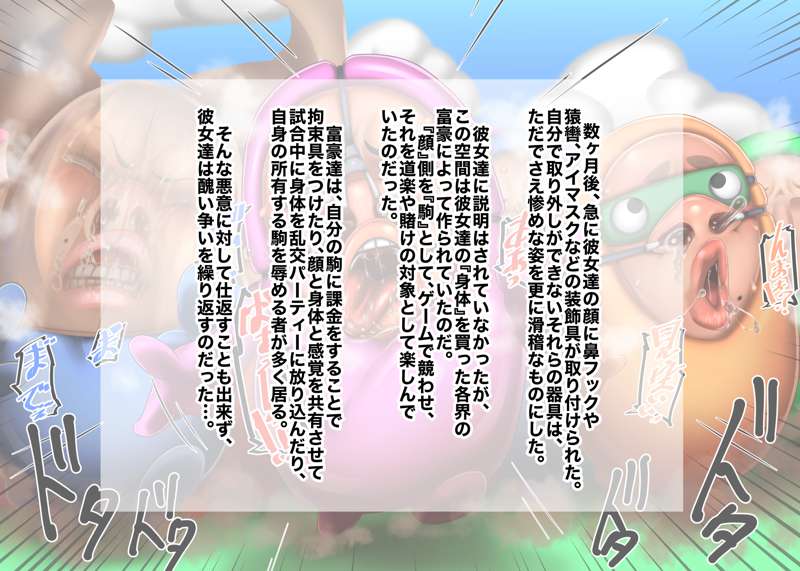 今回はのっぺらぼう要素少なめな仮面化です! その後、某ゲームキャラみたいな2頭身ゴムボディに取り付けられて、元の身体に戻るためにバトルロイヤルするお話! 鼻フックやら顔面パンストやら無様顔もございます! ちょっと気に入ったのでまた描くかも…?
