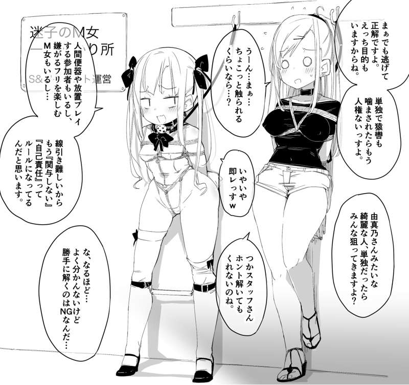 ボールギャグを噛まされた口で必死に拘束を解いてもらえるよう訴えるが、店内は〇〇晒し放置、肉便器設置など様々な趣向の客が来るため縛り手の許可なく解くことは厳禁となっている。