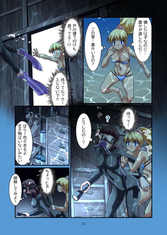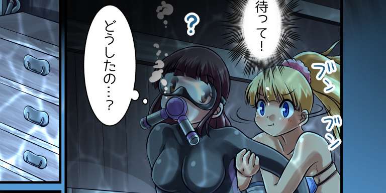 潜水服着てる人と素潜りのコンビってなんか興奮する…うん、さて、ナティカは道案内程度のつもりで潜ったはずなのに、興味に惹かれ家の中にぐいぐい潜って行きます。